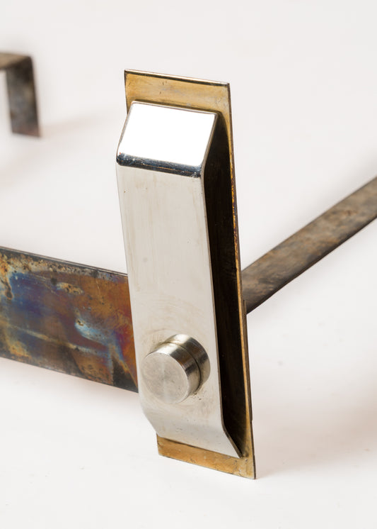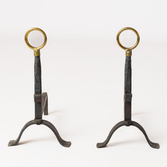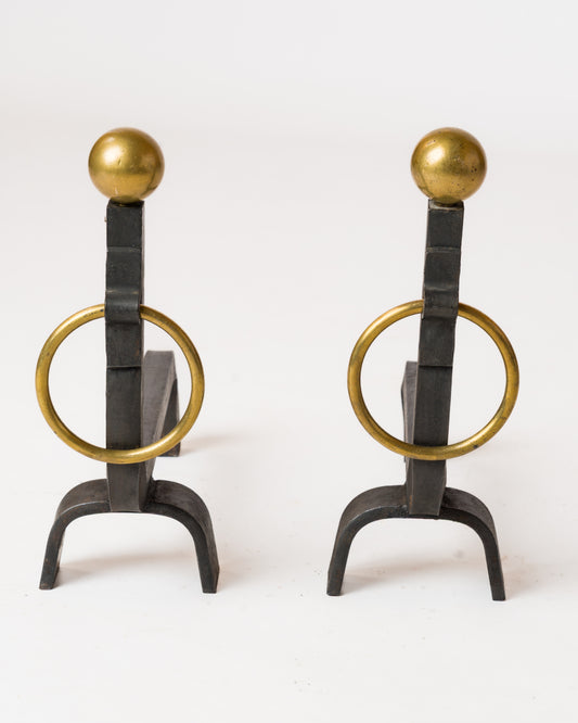Pair of Minimalist Wrought Iron Andirons with Polished Brass Hoop Handles - 1970
