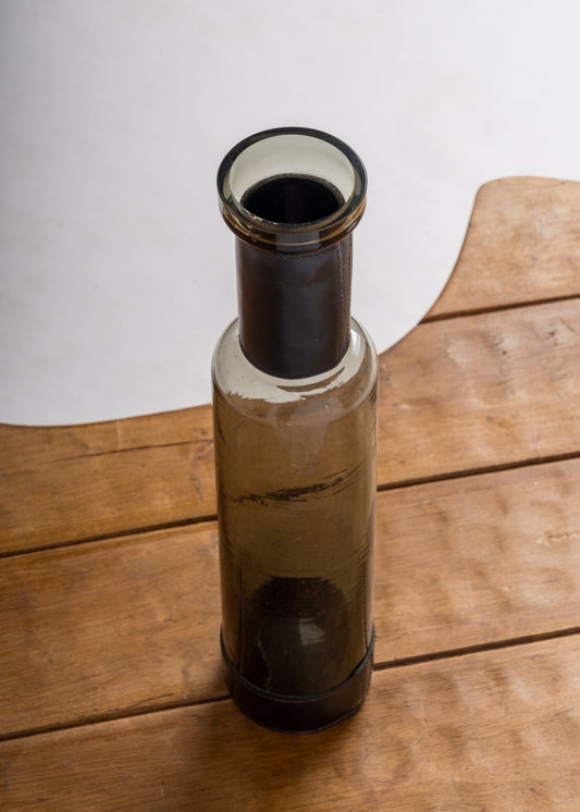 Smoked Black Glass & "Piqué Sellier" Stitched Leather Bottle - England 1960's