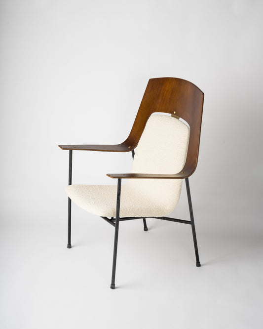 Midcentury Plywood and Cream White Armchair Attributed Robin Day, UK, 1960s