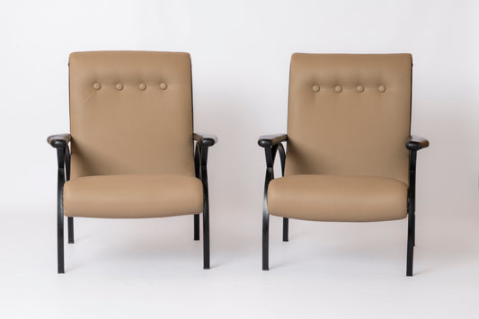 Black Lacquered Steel & Taupe Leather Armchairs in style of Borsani - Italy 1960