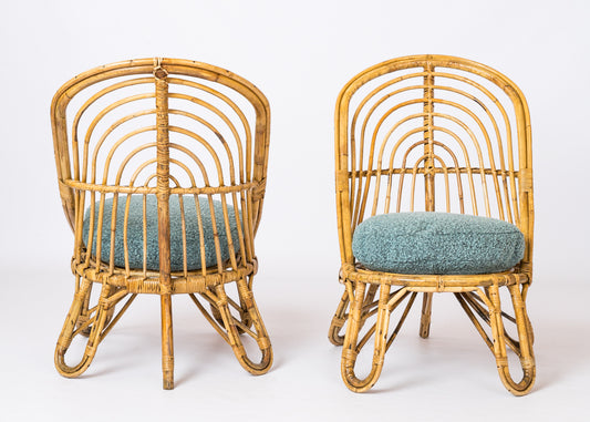 Two L. Sognot Style Rattan Lounge Chairs w. Blue "Chiné" Cushions - France 1950s