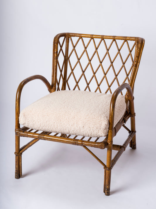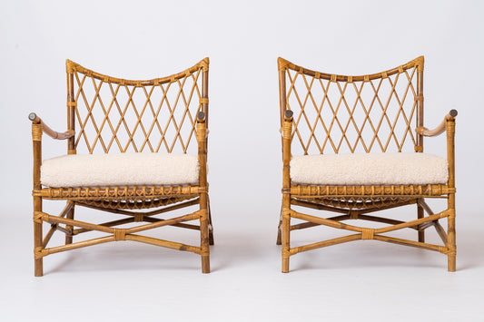 Pair of Braided Rattan Lounge Armchairs w. Off-White Boucle Cushions - 1960's