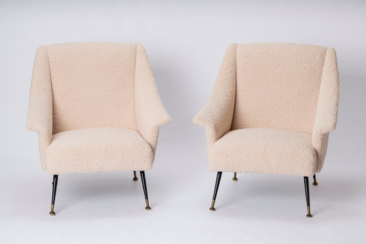 Pair of Creme Bouclé Italian Armchairs with Black and Brass Feet, Italy, 1960s