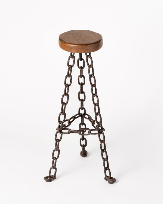 Set of 4 Brutalist Welded Black Marine Chain and Wood Bar Stools - France 1970's
