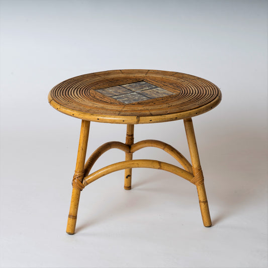 Mid Century Rattan and Ceramic Tiles Tripod Side Table - France 1950's
