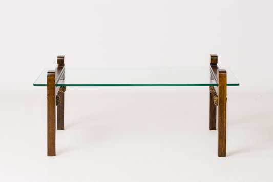 Hand-Carved Wooden Clamp and Glass Coffee Table - France 1970's