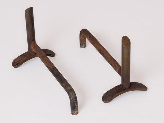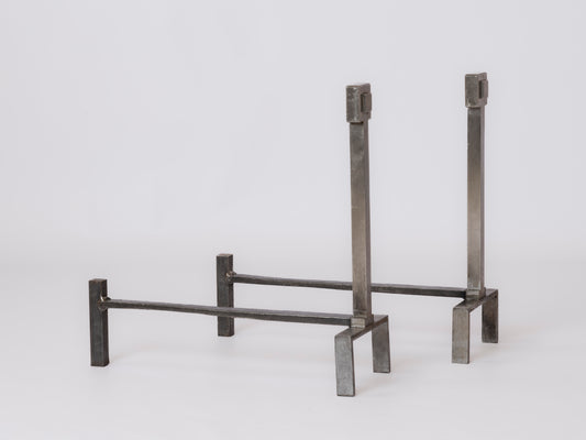 Pair of Minimalist Oxydated Steel Andirons w. Cutaway End - France 1980's