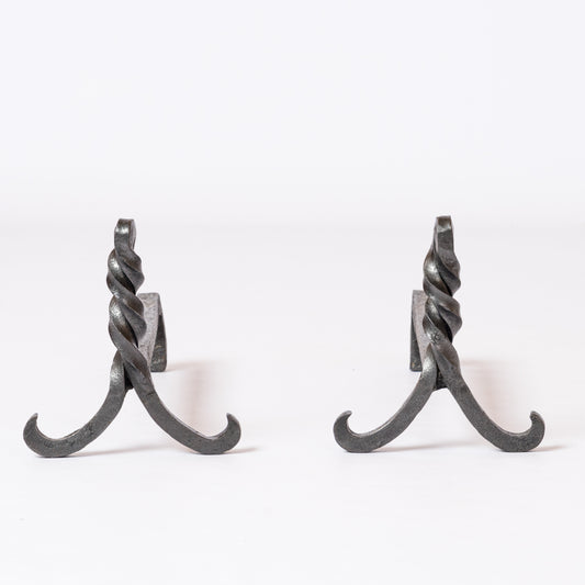Twisted "Fer Forgé" Wrought Iron Andirons with Rings - France 1970s