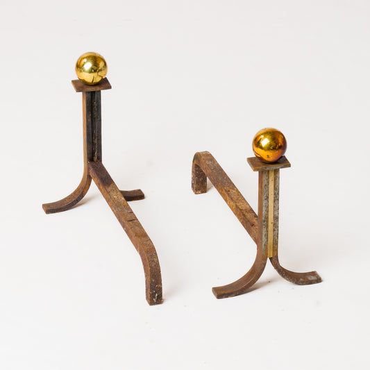 Modernist Iron & Brass Andirons with Patinated Brass Ball Heads - France 1970's