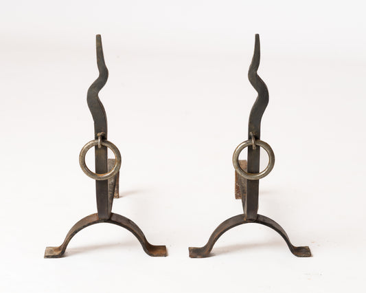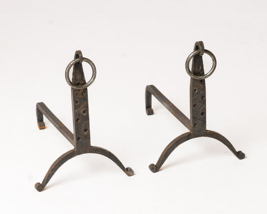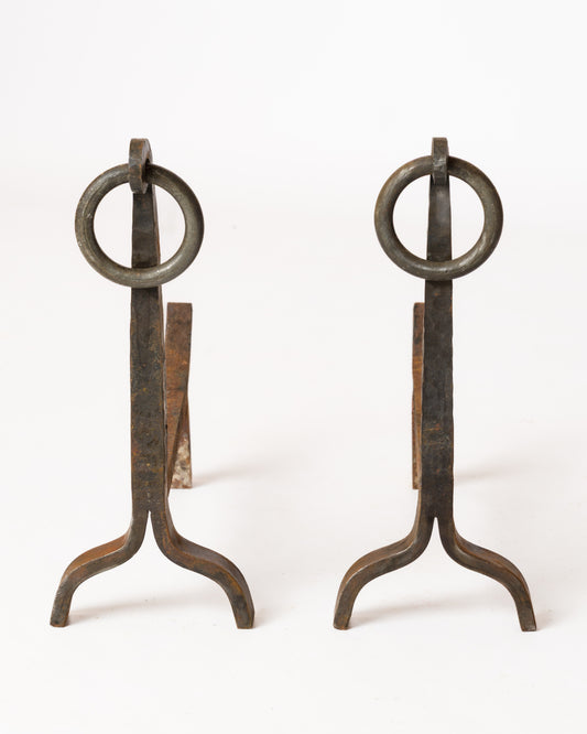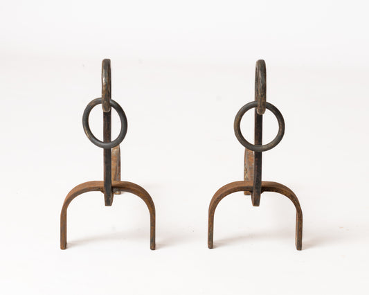 Pair of Chic Wrought Iron Andirons with Rings - France 1970s