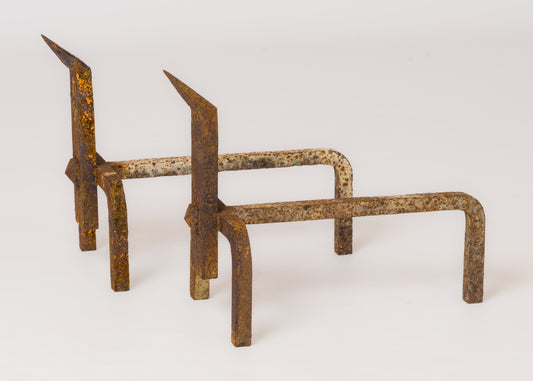 Pair of Constructivist Distressed Wrought Iron Andirons - France 1970's