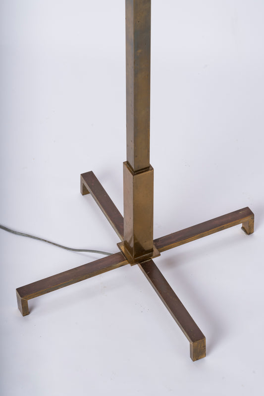 Minimalist Patinated Brass, White Lacquer & Opaline Floor Lamp - Germany 1970's