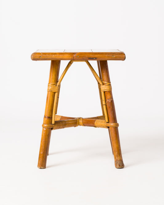Glazed Stoneware Tile and Rattan Side Table att. Bergon Anduze - France 1950's