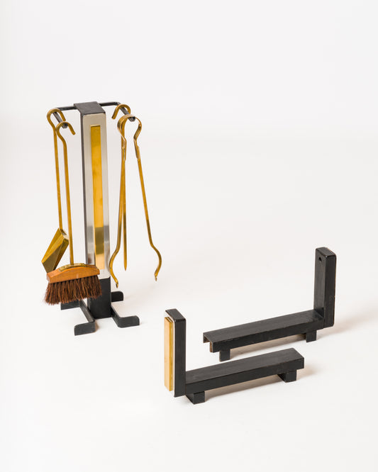 Modernist Brass & Steel Andirons with Fireplace Tools Set - France 1970s
