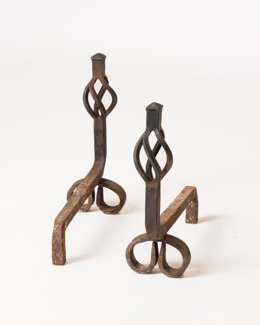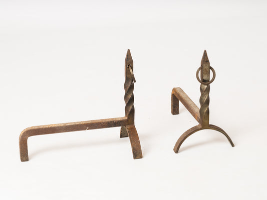 Twisted "Fer Forgé" Wrought Iron Andirons with Rings - France 1970s