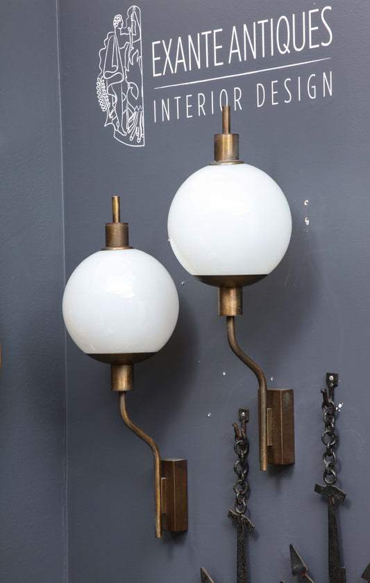Pair of Patinated Brass and Opaline Sconces - Italy 1960's