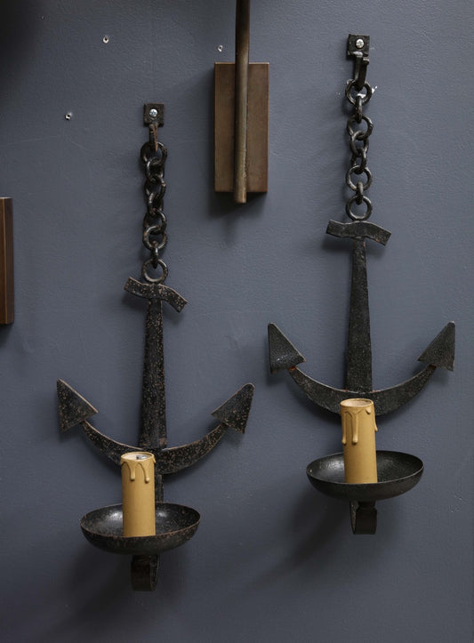 Pair of Brutalist Black Enameled Steel Anchor Shaped Sconces - France 1960's