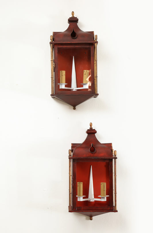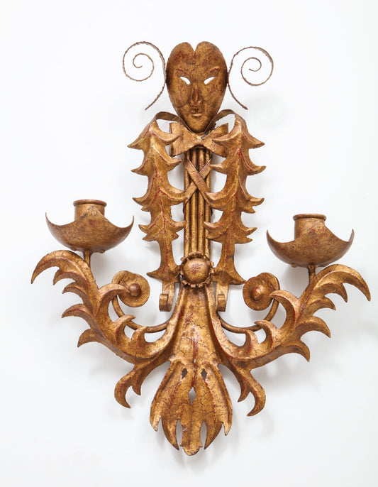 Rare Pair of Gilt "tôle peinte" Venice Carnival Theme Sconces, France, 1960s