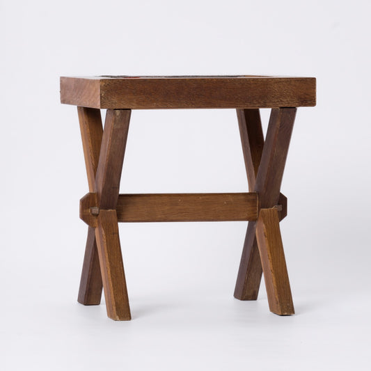 Brutalist "Compas" Dark Oak and Talosel Color Tiles Side Table - France 1970's