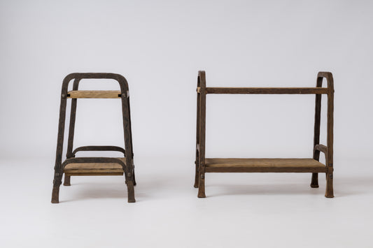 Marolles Inspired Brutalist "Gouge" Oak & Steel Side Tables - France 1970's