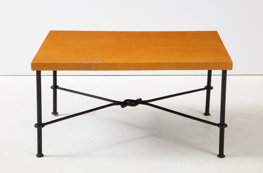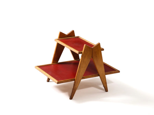 French Reconstruction Era Solid Oak & Red Moleskine Tray Table - France 1950's