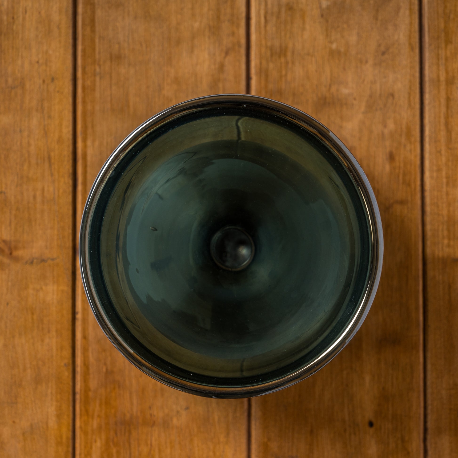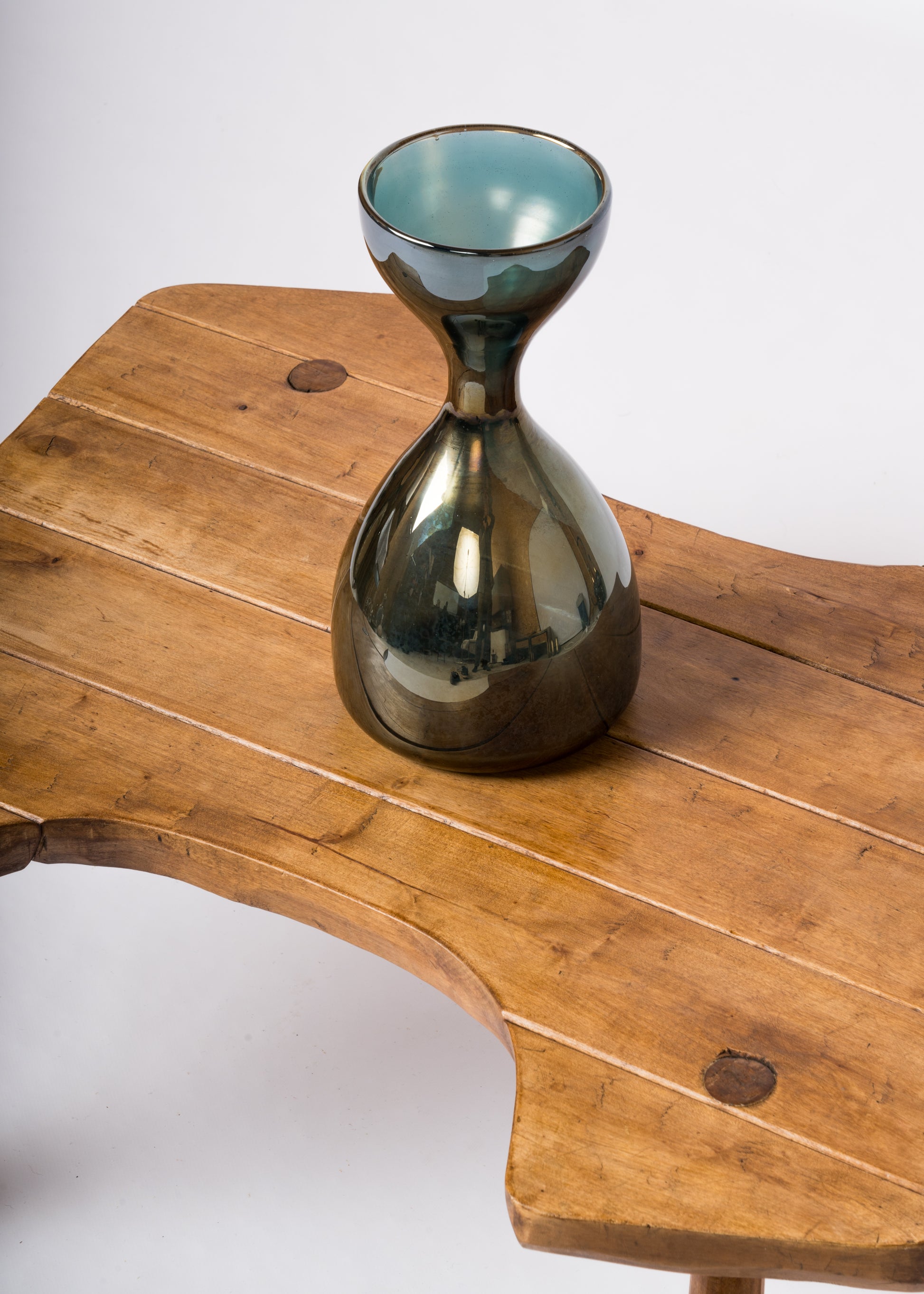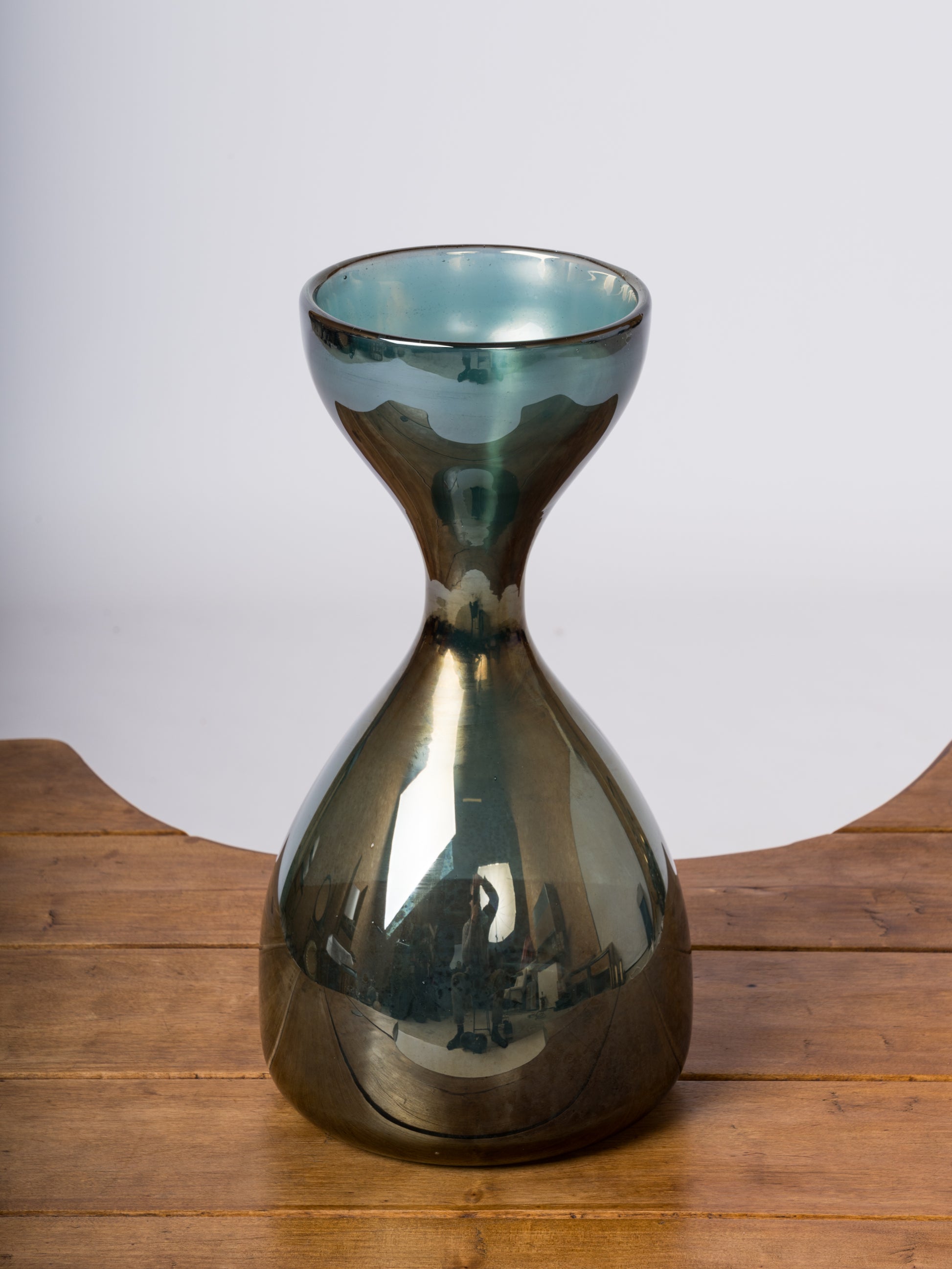 A blue-tinted glass vase with a light gilt glaze. Hourglass shape. In good vintage condition. Some scratches on the underside of the vase.