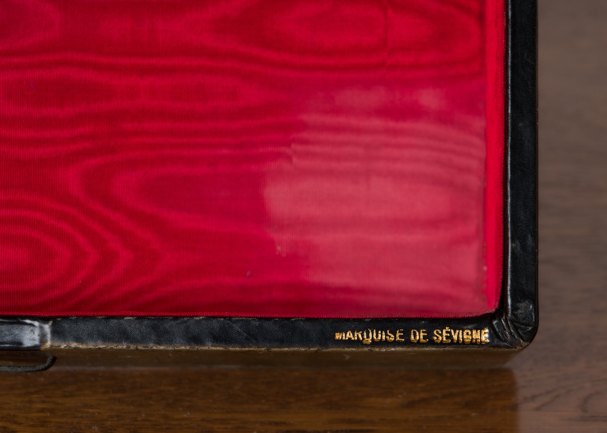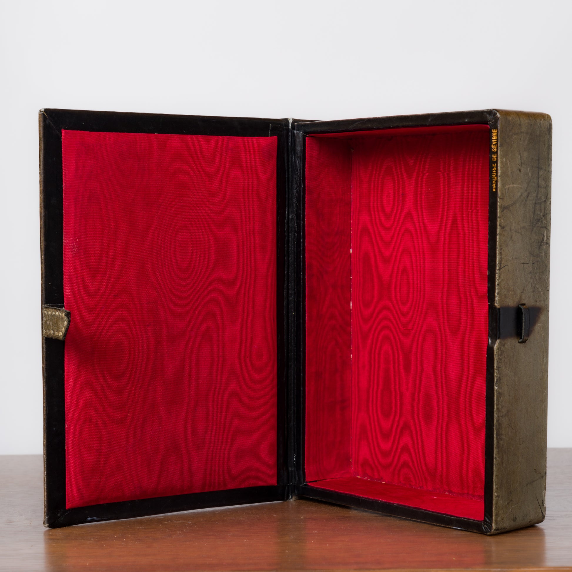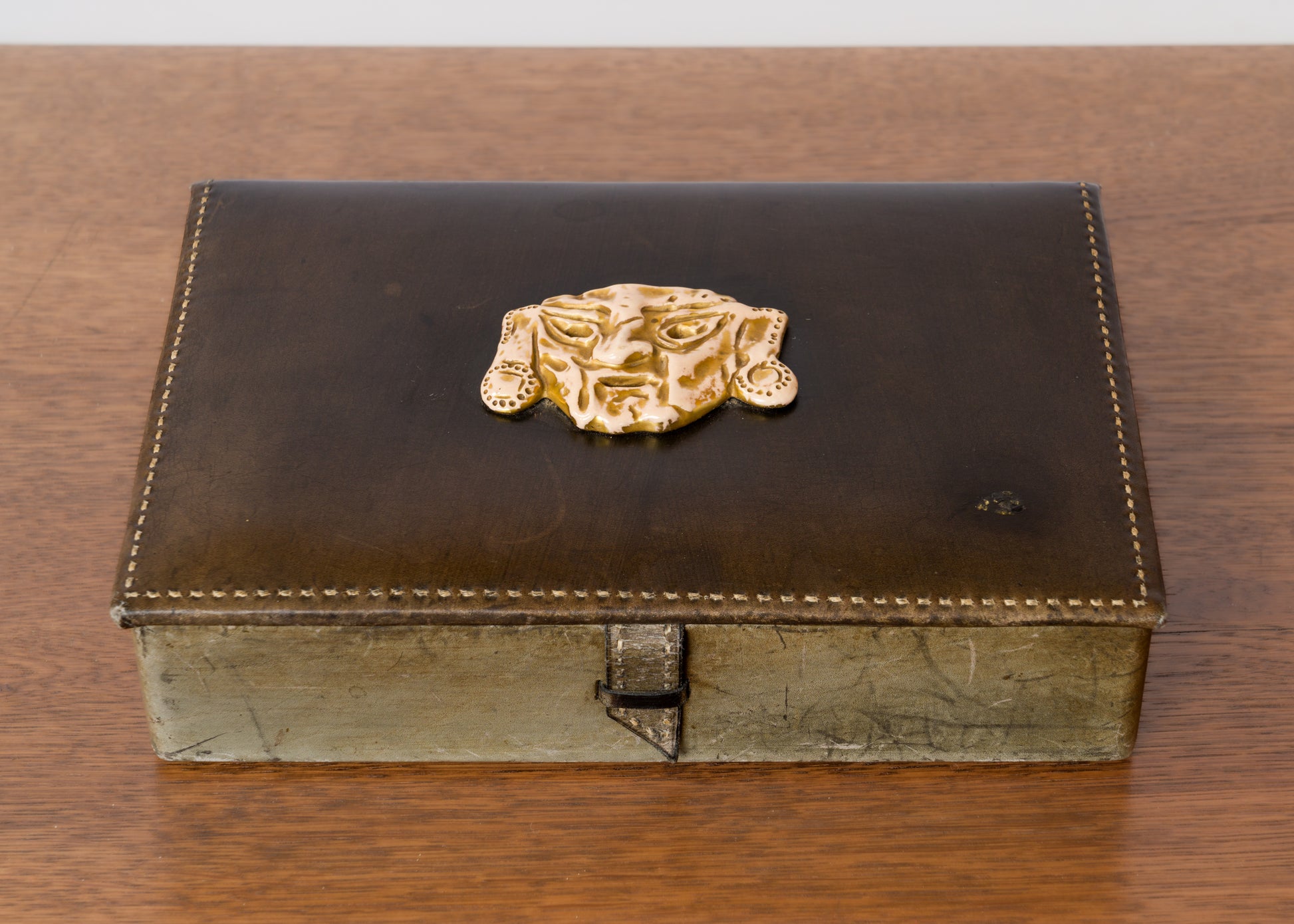 Decorative advertising box in dark gray leather. Ceramic mascaron depicting a faun's head. France, 1960s. Stamped "Marquise de Sévigné". Signs of wear, scratches, and signs of use on the leather.