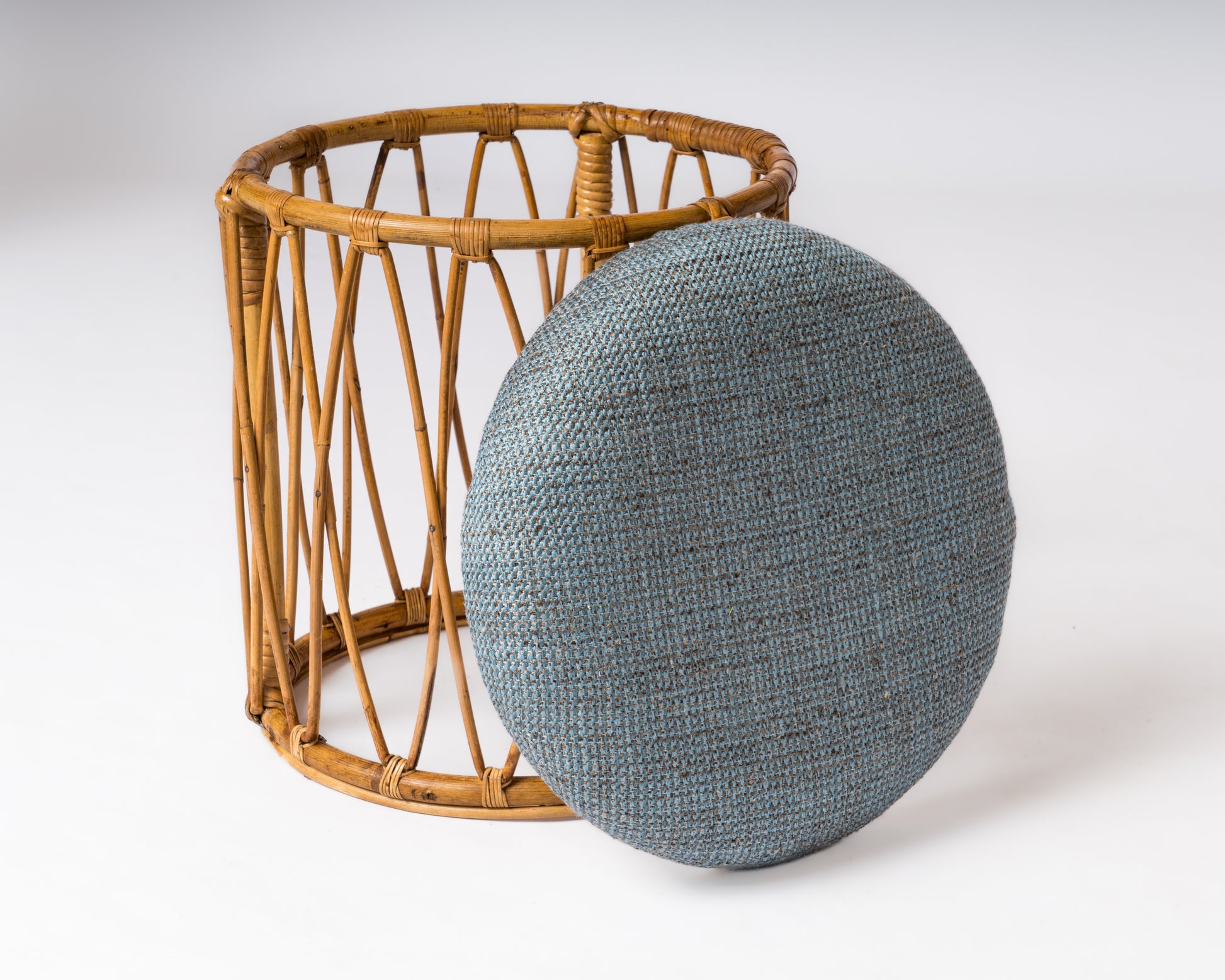 Drum Shaped Rattan Stool With Blue Mottled Fabric Upholstery - France 1970's