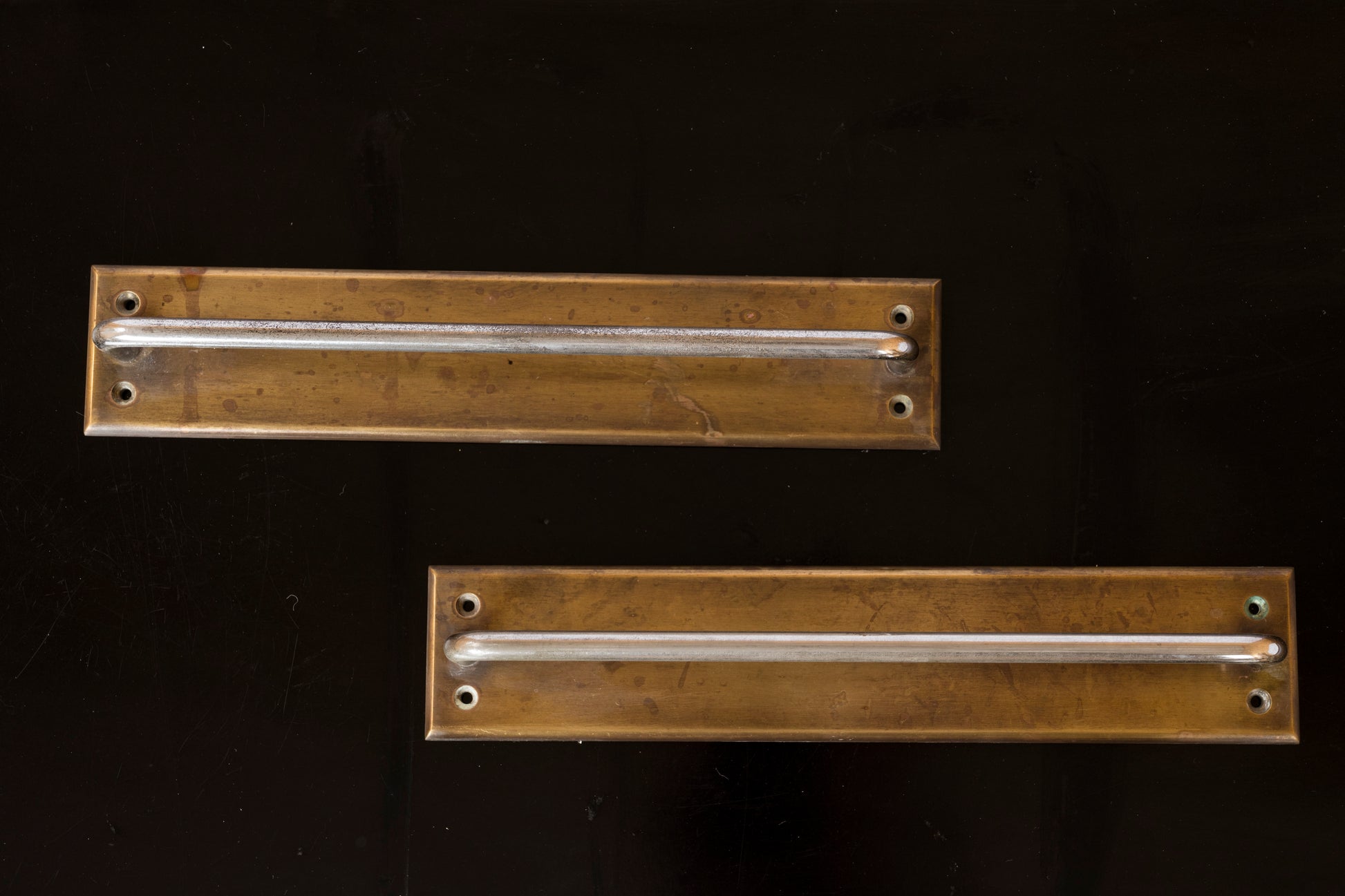 Pair of rectangular door handles, each consisting of a patinated bronze plate onto which a bent steel handle is screwed. In good vintage condition.