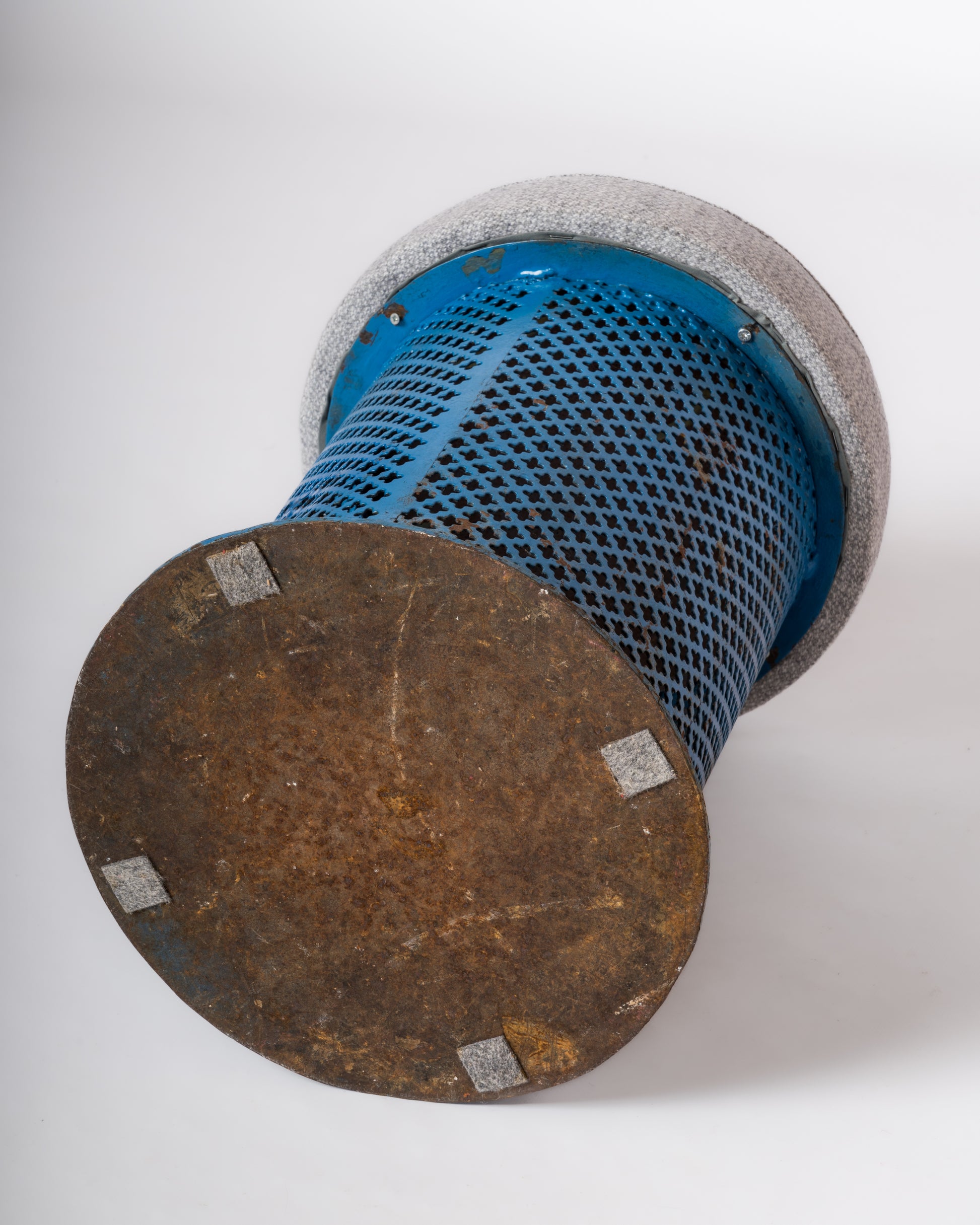 Stool in blue perforated metal frame. In the style of Mathieu Mategot Original paint with some loss and oxidation. The stool can be sandblasted and powder-coated in the desired color. New gray wool twill upholstery.