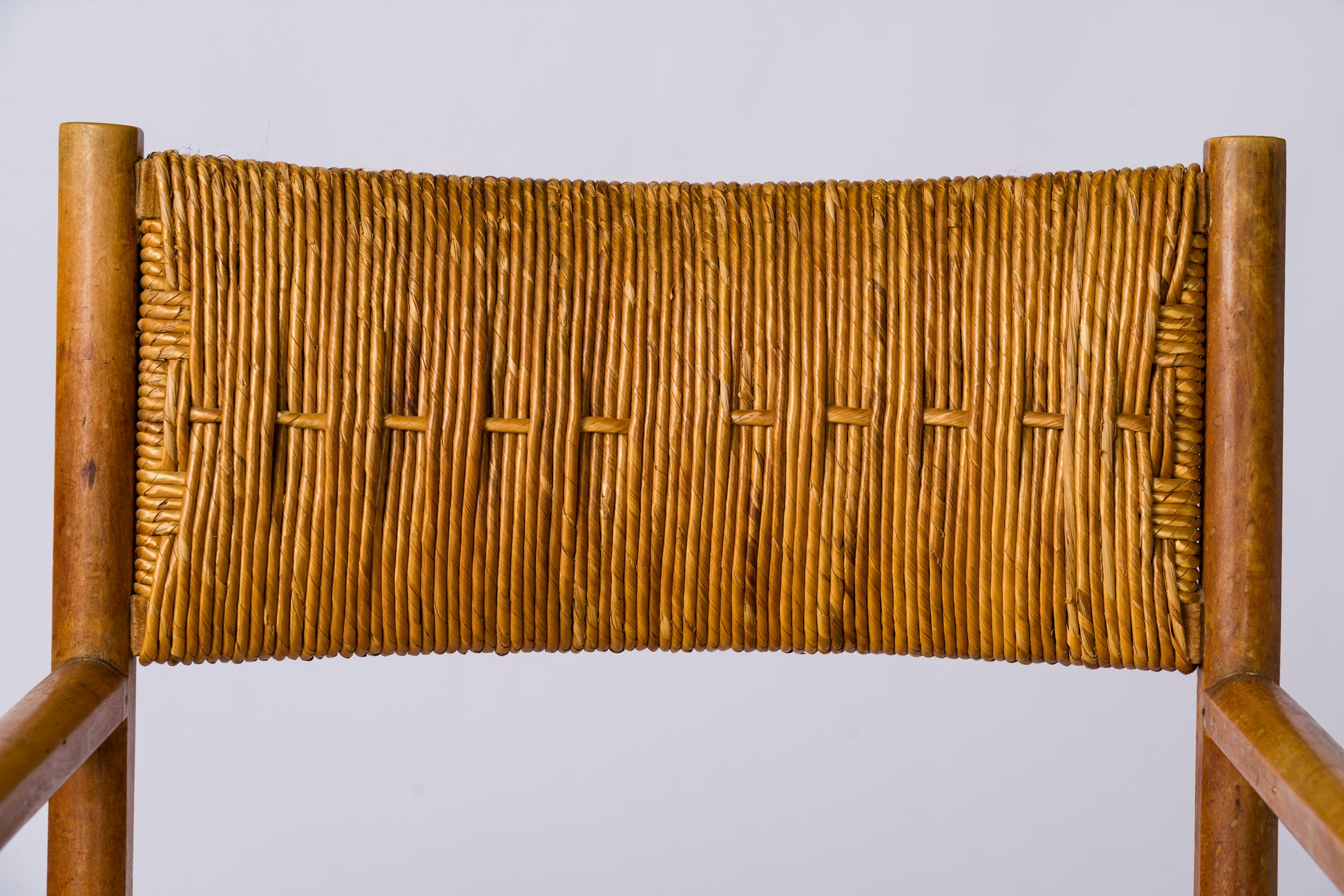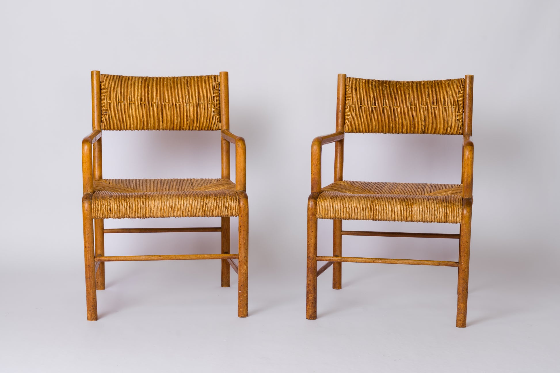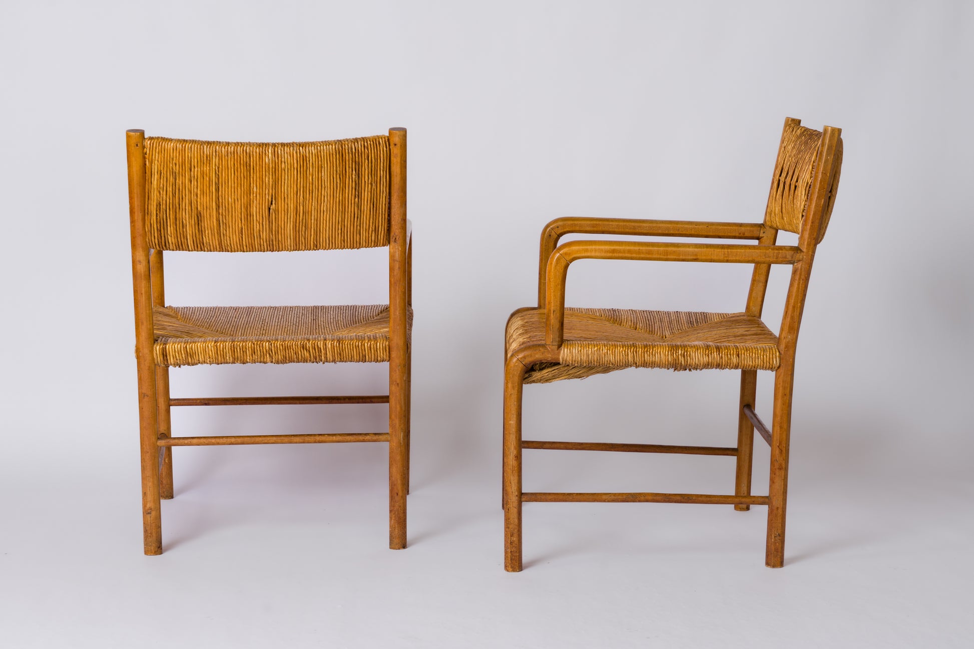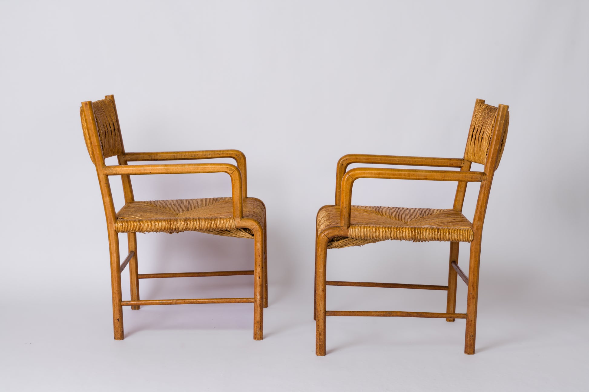 Pair of beechwood straw-seated armchairs by Emanuele Rambaldi. Italy, circa 1933. Armrests attached three-quarters of the way along the hexagonal seat support. Thick woven straw on the back and seat, with openwork motifs on the back. In good vintage condition, stable and without play. A small chip on the back of one of the armchairs, as shown in the last photo.